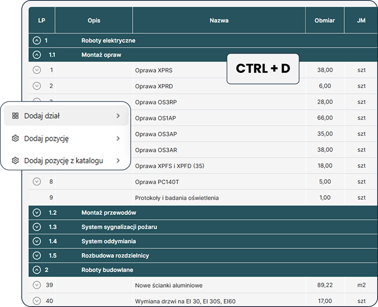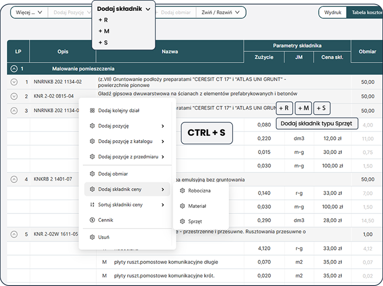 Składniki obmiaru zwiększają przejrzystość i pozwalają kontrolować poprawność wyliczeń – szczególnie przy rozbudowanych zakresach robót.Nie musisz tworzyć wszystkiego od zera – skorzystaj z gotowych pozycji i składników z katalogów robót.