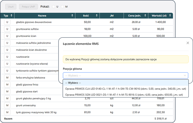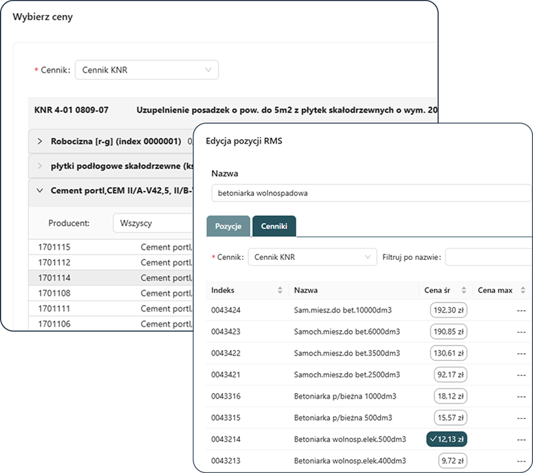Katalogi UMP i KNR pozwalają błyskawicznie tworzyć kompletne pozycje z gotowymi składnikami i technologiami – bez ryzyka pominięć.