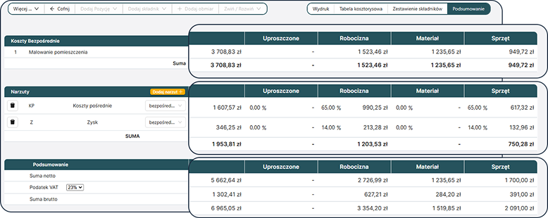 Widok podsumowania pomaga w szybkiej analizie efektywności kosztorysu, pozwala też dopasować narzuty do warunków projektu.