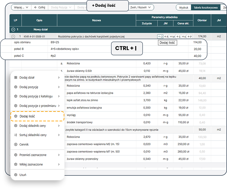 Aby precyzyjnie określić ilość robót w pozycji, dodaj składniki ilości – czyli obliczenia opisujące zakres prac.